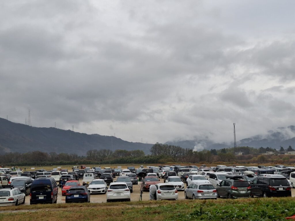 保津川河川敷の駐車場は舗装されていないため、地面はドロドロの水たまり…。