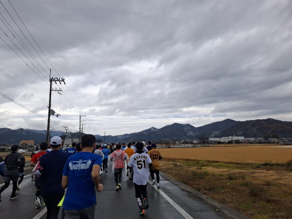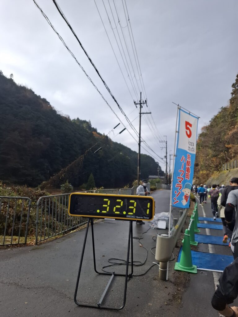 国道に出て少し走りやすくなってからは、ウォーミングアップも兼ねて周りのペースに合わせる感じで走り、5kmの通過は32分34秒。