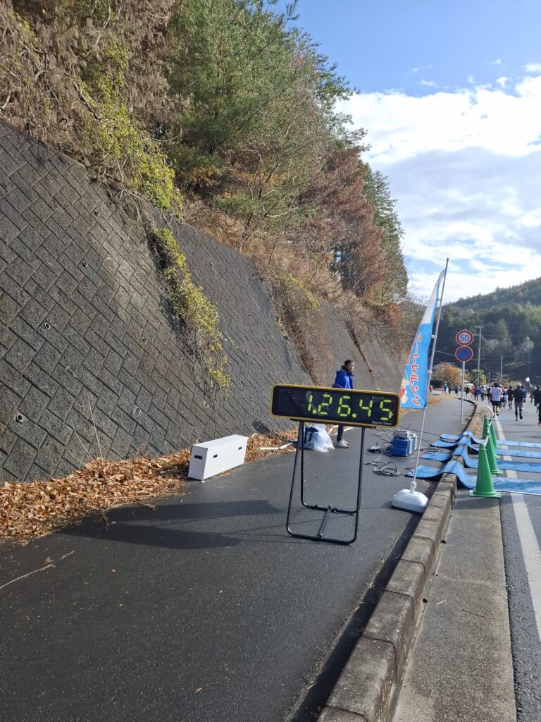 下りが終わり、平坦な道に出ると一気に足にも心肺にも疲れが来ましたが、残り2km、残り1kmの看板を目標に、できるだけペースを落とさないように頑張りました。