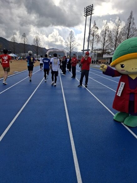 トラックの数100メートルが本当に長く感じたけど、ゴール手前にいた亀岡市のゆるキャラ「明智かめまる」くんにタッチしてゴール!