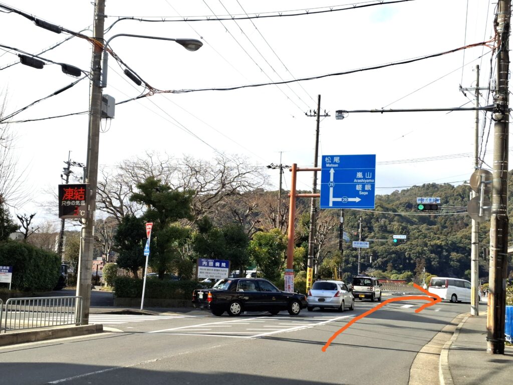 嵐山の観光スポット・渡月橋を左斜め前に望みながら、清滝道三条で右折。