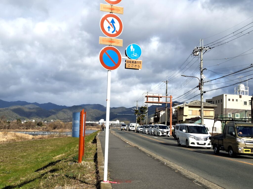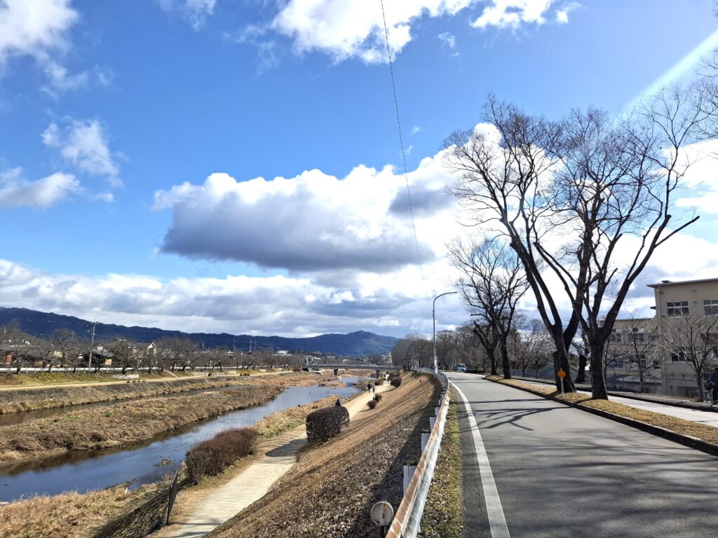 西へしばらく進むと桂川にぶつかるので、「松尾橋」の手前で右折。桂川沿いを走ります。