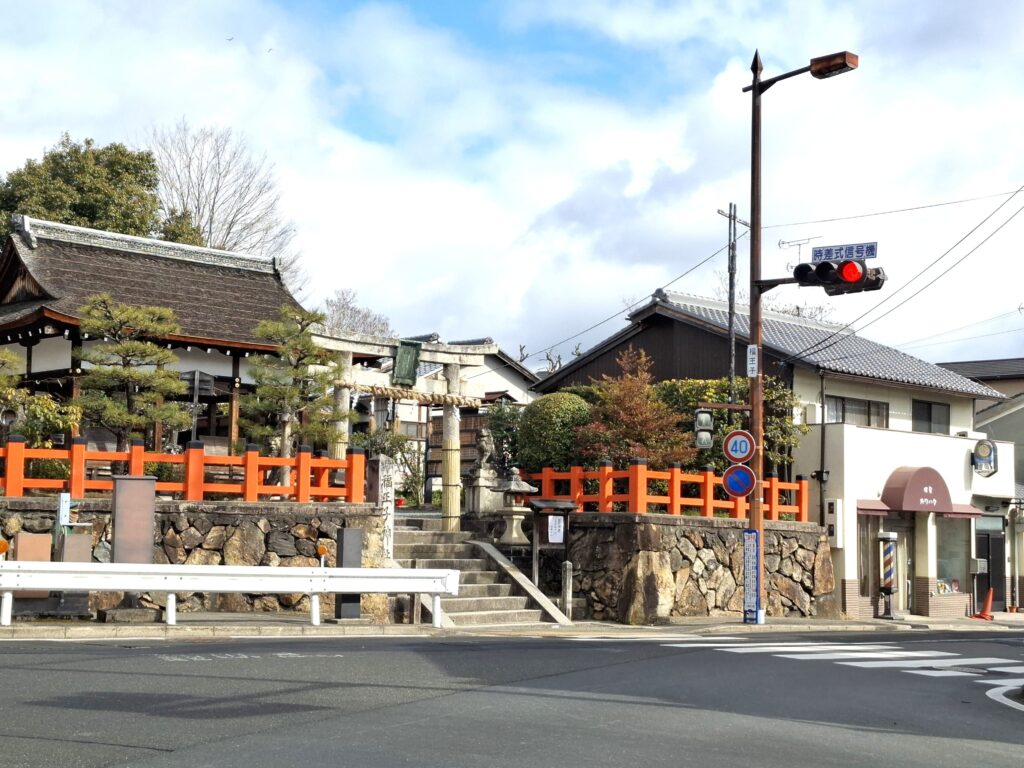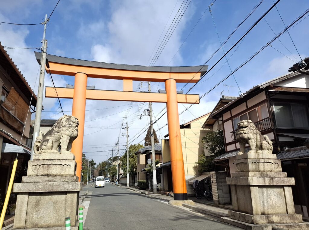 北大路通をしばらく進み、15km地点を越えたあたり、今宮門前通を左折。狛犬と鳥居が目印です。
