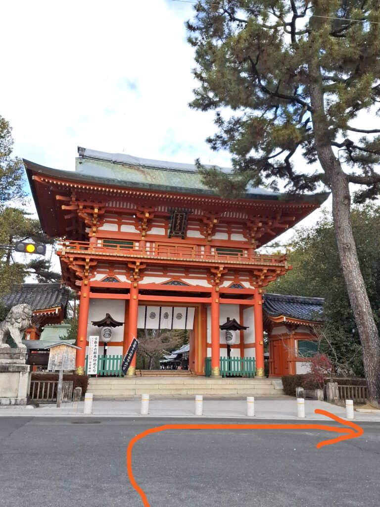 まっすぐ進むと正面に見えるのが今宮神社。朱色の門の前を右に曲がります。