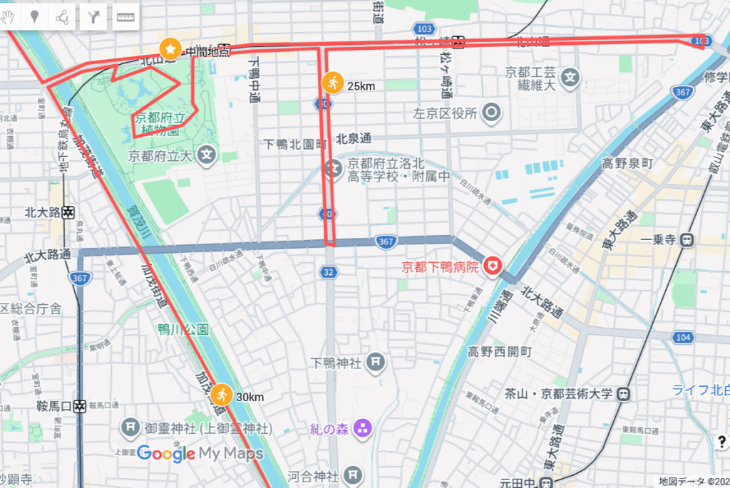 今回の試走では、北山通と下鴨本通の折り返しコースは割愛。