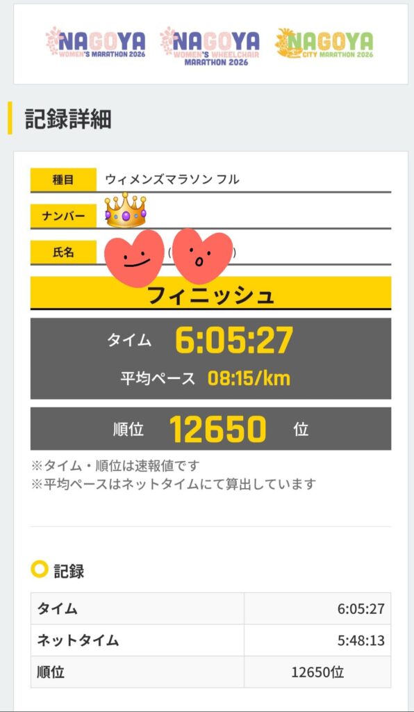 過去2回のフルマラソンより20~30分程度遅いタイムでのゴールとなりましたが、憧れだった名古屋ウィメンズマラソンのゴールは感動もひとしお。