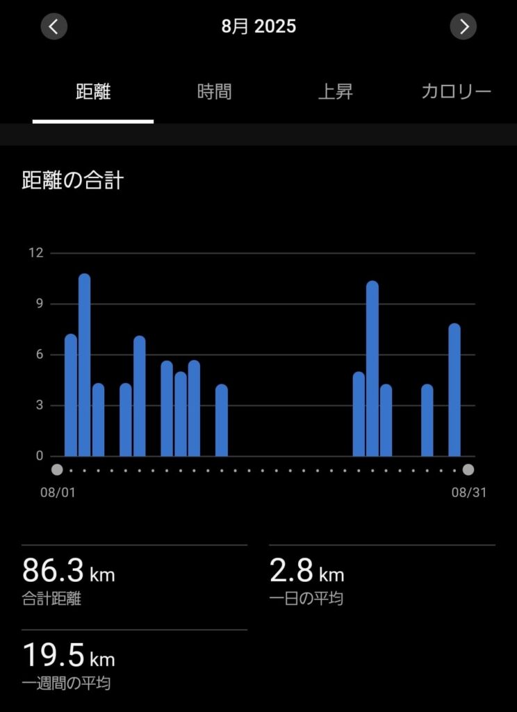 8月は14回のランニングで、トータル86.3kmを走りました。