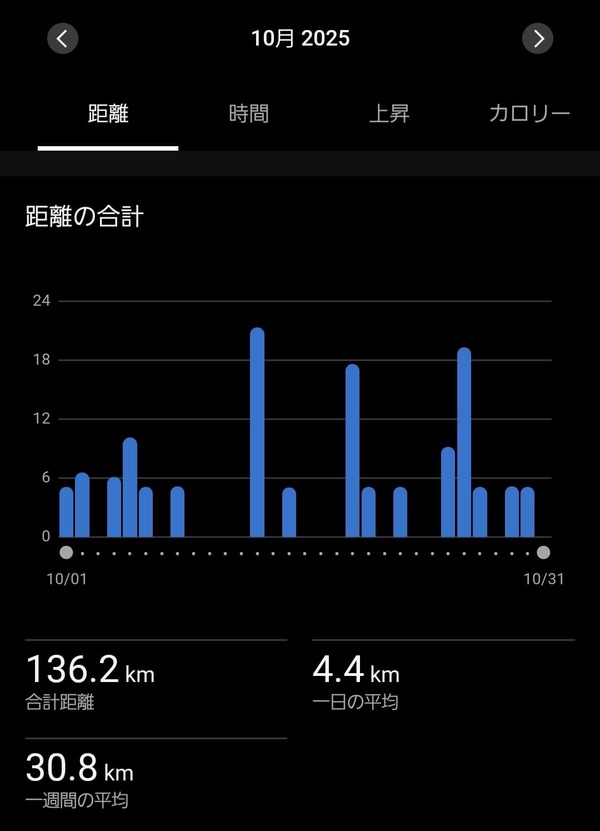 先月(2025年9月)は120.3kmだったので、前月比約113%を走ったことになります。